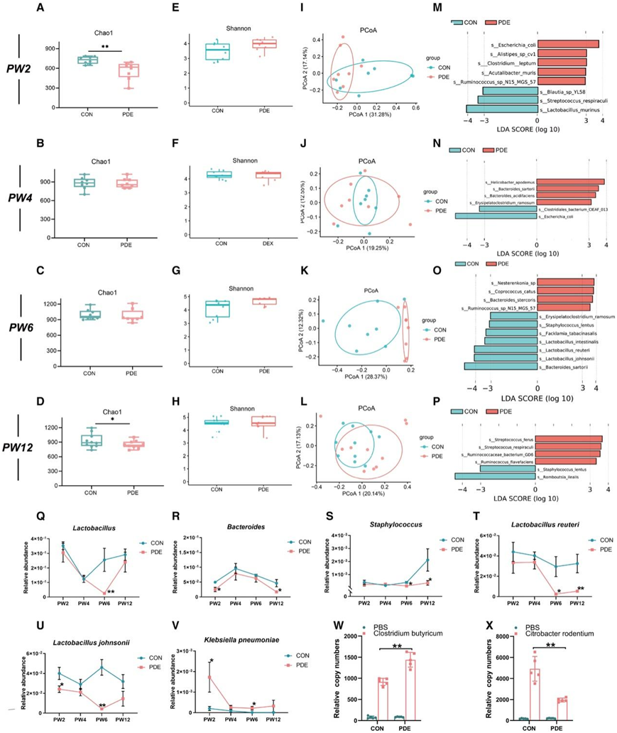(A–D) 第 2 周、第 4 周、第 6 周和第 12 周肠道微生物群的 Chao1 指数。(E–H) 第 2 周、第 4 周、第 6 周和第 12 周肠道微生物群香农指数。(I–L) 基于 PW2、PW4、PW6 和 PW12 肠道微生物群 Bray-Curtis 距离的 PCoA 图。(M–P) PW2、PW4、PW6 和 PW12 物种水平肠道微生物群的 LEfSe 分析。(Q-S)粪便中乳酸菌、拟杆菌和葡萄球菌的相对丰度。 (T-V)粪便中Lactobacillus reuteri、Lactobacillus johnsonii和 Klebsiella pneumoniae的相对丰度。(W) PW5 雌性子代大鼠粪便中丁酸梭菌的相对拷贝数。(X) PW5雌性子代大鼠粪便中啮齿类柠檬酸杆菌的相对拷贝数。