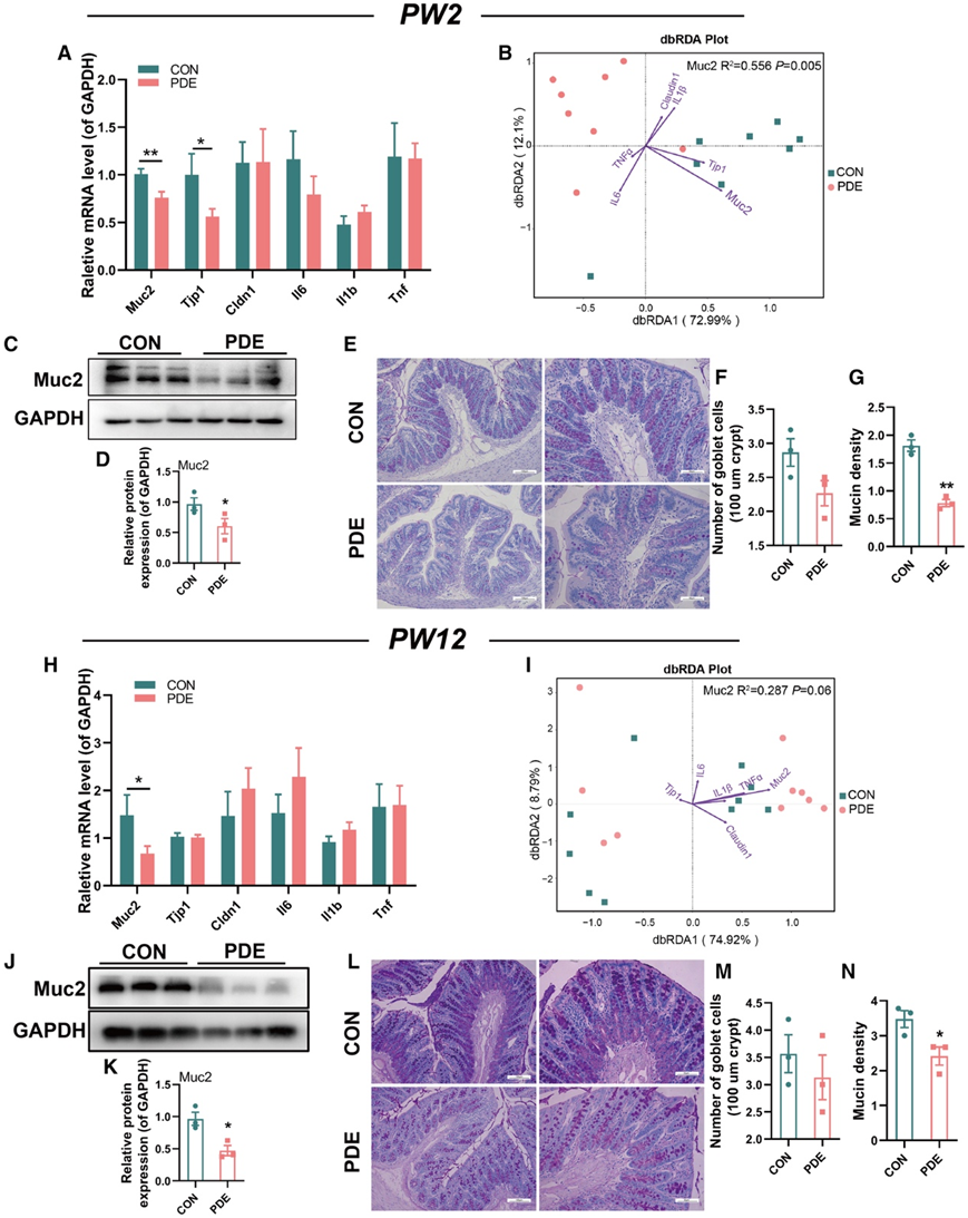 (A,H) PW2 和 PW12 时结肠Muc2、Tjp1、Cldn1、Il6、Il1b和Tnf的 mRNA 表达。 (B,I) dbRDA 图显示了第 2 周和第 12 周结肠基因表达与肠道微生物群变化之间的关系。(C,D,J,K)PW2 和 PW12 时 Muc2 的蛋白质水平。(E,L) PW2 和 PW12 结肠的 PAS 染色。(F,G,M,N) 使用 ImageJ 分析 PW2 和 PW12 中的杯状细胞数量和粘蛋白密度。