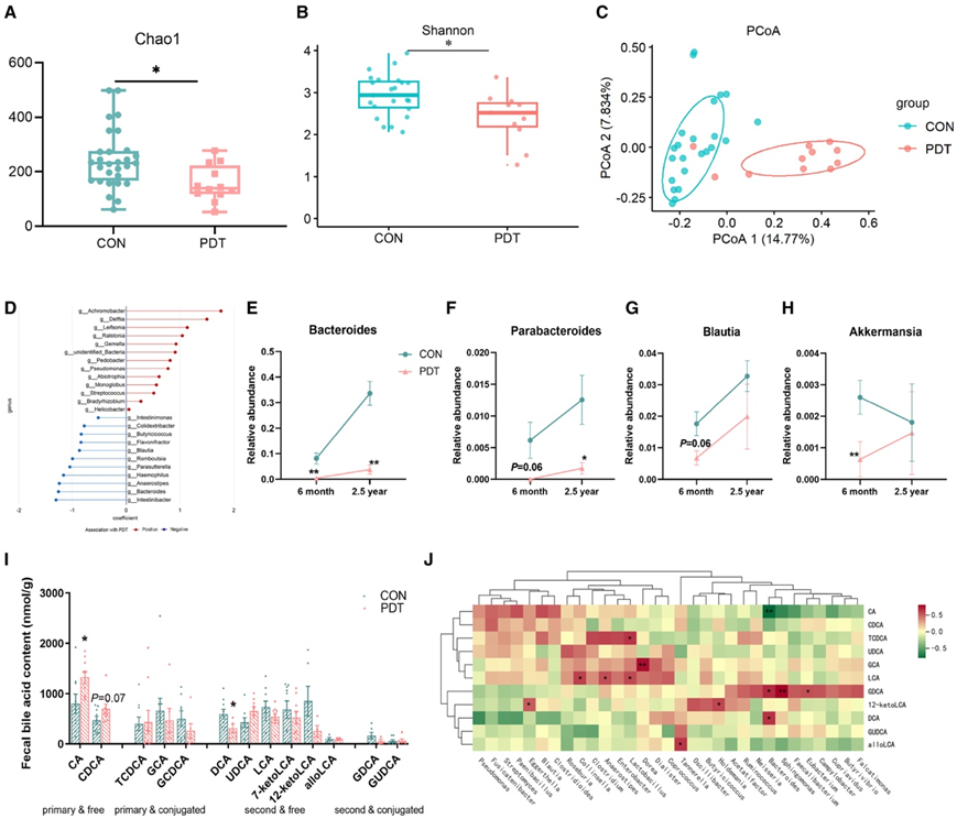 (A) 2.5 岁女婴肠道菌群 Chao1 指数。(B) 2.5 岁女婴肠道微生物群香农指数。(C) 基于 2.5 岁女婴肠道微生物群 Bray-Curtis 距离的 PCoA 图。(D) 通过 MaAsLin2 调整其他混杂因素后与 PDT 相关的属水平的细菌。(E-H) 6 个月至 2.5 岁女婴粪便中拟杆菌属、副拟杆菌属、布劳氏菌属和阿克曼氏菌的相对丰度。(I) 2.5 岁女婴粪便胆汁酸谱。(J) 细菌与粪便中胆汁酸的相关热图。