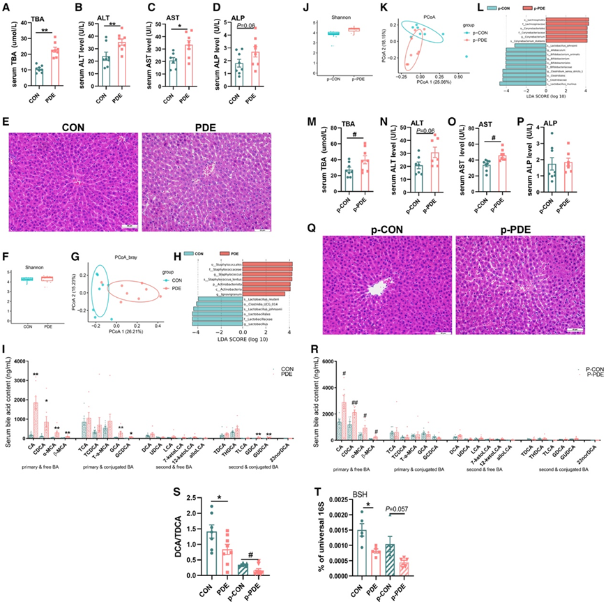 (A–D) 对照组和 PDE 组的血清 TBA、ALT、AST 和 ALP 水平。(E) 对照组和 PDE 组的肝脏 H&E 染色。(F–H) 对照组和 PDE 组肠道菌群的 Shannon 指数、基于 Bray-Curtis 距离的 PCoA 图以及 LEfSe 分析。(I) 对照组和 PDE 组的血清胆汁酸代谢谱。(J–L)香农指数、基于 Bray-Curtis 距离的 PCoA 图以及 p-对照组和 p-PDE 组肠道微生物群的 LEfSe 分析。(M-P) p-对照组和 p-PDE 组的血清 TBA、ALT、AST 和 ALP 水平。(Q) p-对照和 p-PDE 组的肝脏 H&E 染色。(R) p-对照组和 p-PDE 组的血清胆汁酸代谢谱。(S) 血清 TDCA 与 DCA 的比率。(T) 粪便 BSH 表达。