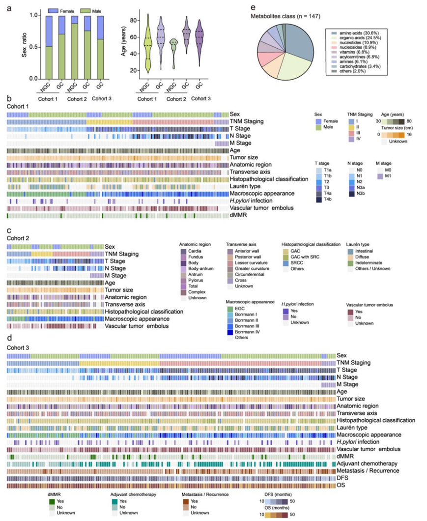 (a-d) 队列1-3受试者的临床特征。(e) 研究中检测到的代谢物的种类和比例。