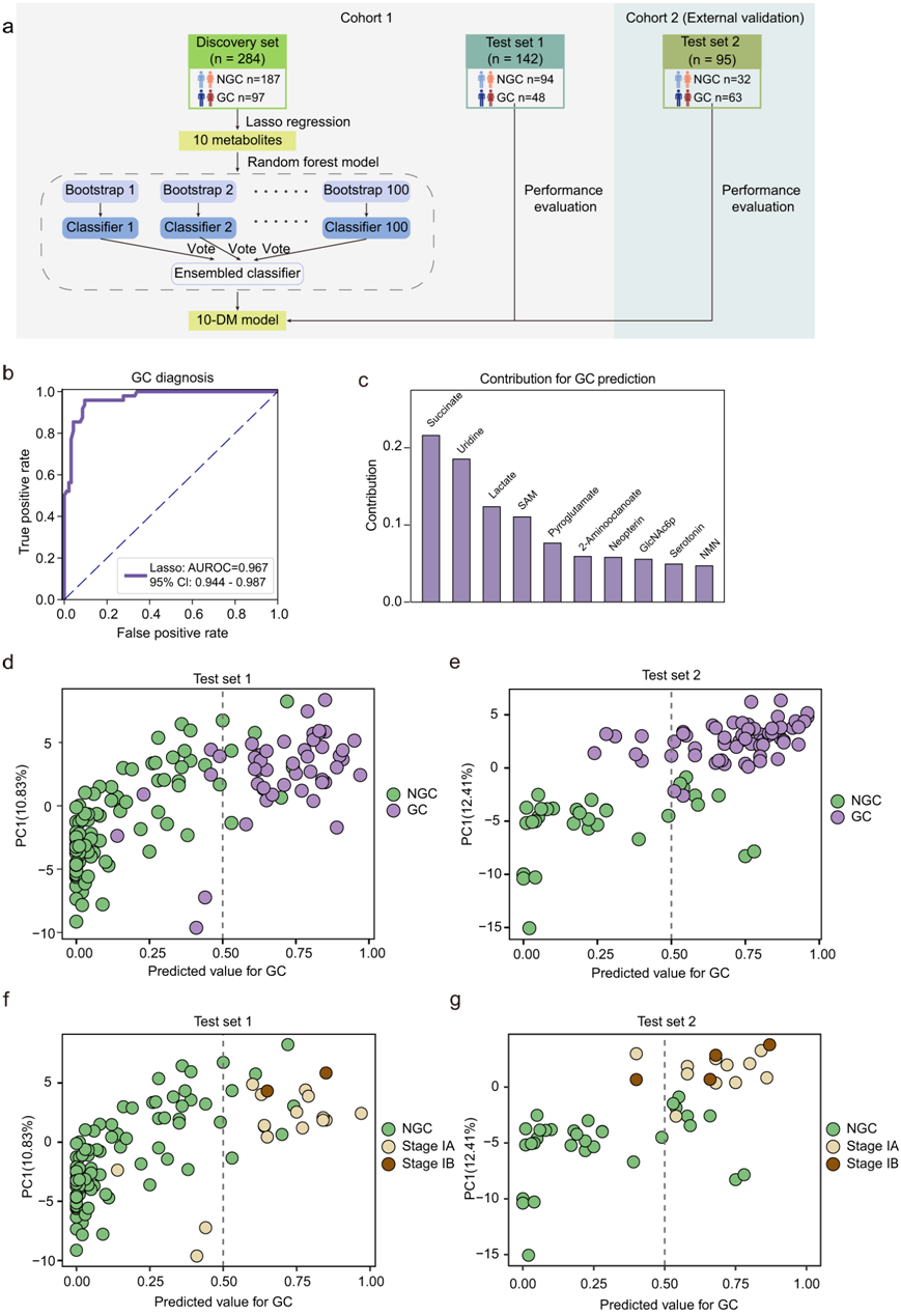 (a) 建模流程的设计。 (b) 测试集1中诊断GC患者的受试者工作特征(ROC)曲线。 (c) 10种代谢物对10-DM模型的贡献。 (d-g) 10-DM 模型的预测性能。