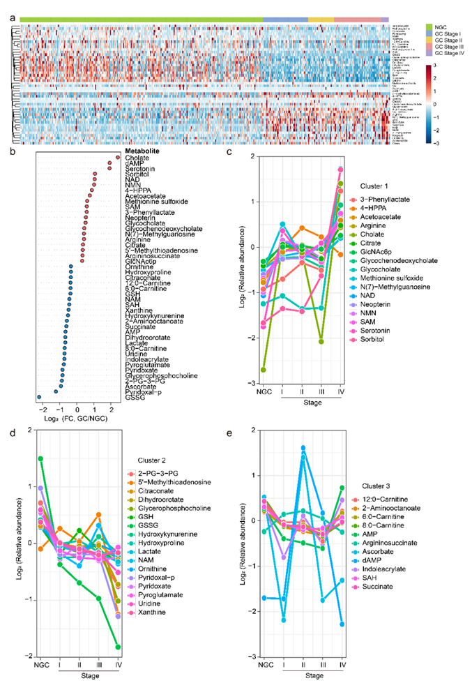 (a)队列1中GC和NGC之间代谢物差异的热图。(b) GC和NGC的代谢物差异。(c-e) 聚类1-3代谢物的动态变化。
