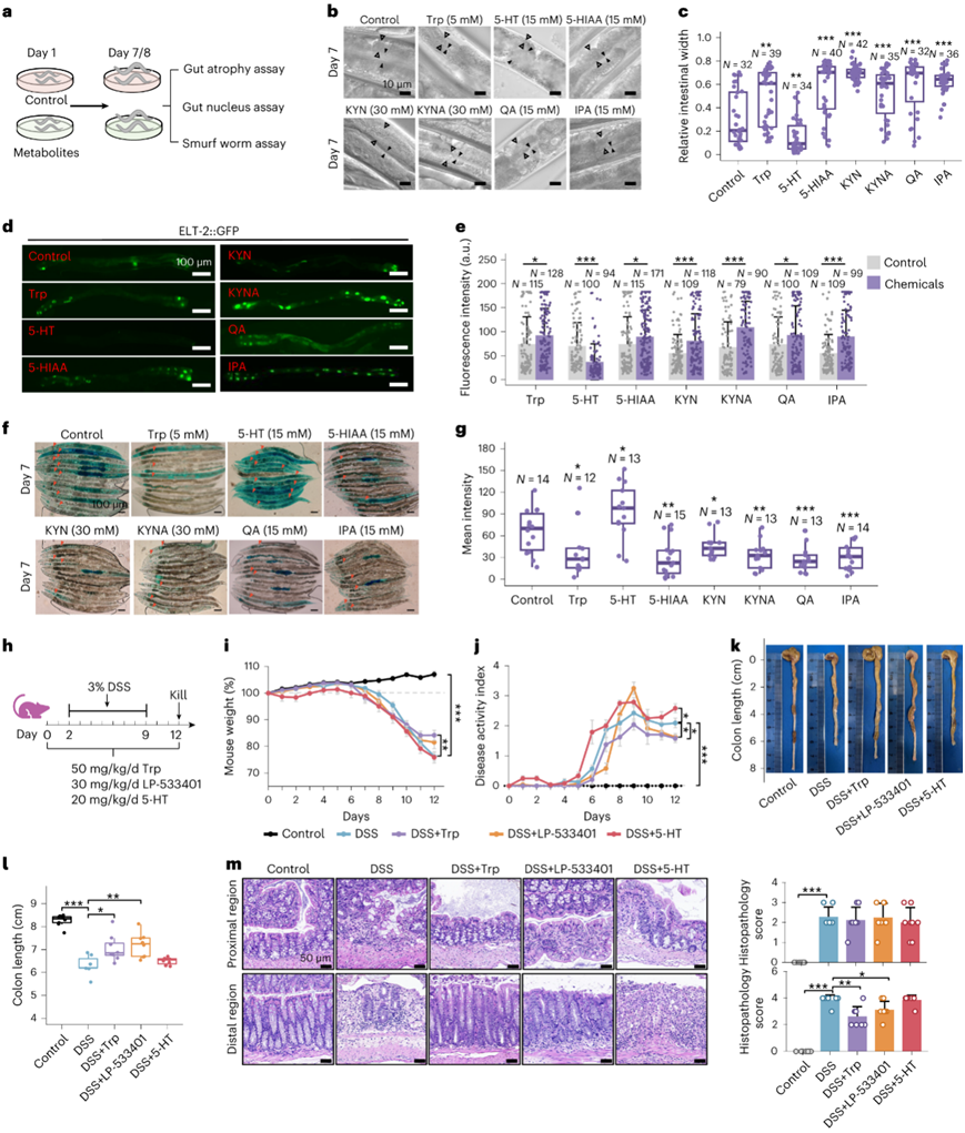(a) 探索色氨酸代谢功能的工作流程图。 (b) 代表性 DIC 显微图像显示 D7 上的肠萎缩。(c) 说明D7上相对肠道宽度的统计分析的箱线图。(d) D7 上elt-2 ::gfp 线虫的代表性显微照片。(e) 显示平均 GFP 强度的条形图。(f) D8 上蓝色食用染料中浸泡 5 小时的线虫的代表性 DIC 图像。(g) 代表平均染料渗漏强度的箱线图。(h)实验流程。 (i) 每日小鼠体重。(j) 由体重减轻、粪便稠度和出血确定的疾病活动指数。(k) 小鼠结肠长度的代表性图片。(l) 结肠长度的统计分析。(m) 升结肠和降结肠的 H&E 图像。
