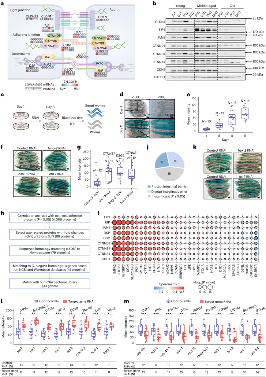 (a) 近端和远端结肠中三个年龄组细胞-细胞连接基因的蛋白质和 mRNA 表达量。 (b) 免疫印迹分析。(c) 评估线虫肠道屏障完整性的实验流程。 (d) 线虫的代表性 DIC 显微镜照片,显示染料随着年龄的增长从肠腔渗漏到体腔中。(e) 野生型线虫在 D1、D5、D8 和 D11 上与年龄相关的 Smurf 表型的量化。(f-g) 代表性 DIC 图像和箱线图(显示沉默细胞-细胞粘附相关基因对肠道屏障功能的影响)。 (h) 用于Smurf检测的年龄相关基因筛选流程图。 (i) 气泡图显示 33 种选定的蛋白质和 9 种细胞间粘附蛋白之间的相关性。(j) 饼图显示了表型检测的总体结果。 (k) 在成年第 8 天在蓝色染料中浸泡 5 小时的hpx-2 RNAi 处理、ttx-7 RNAi 处理和对照 RNAi处理的代表性 DIC 图像。 (l-m) 箱线图说明用RNAi敲低相应基因后的平均染料渗漏强度。