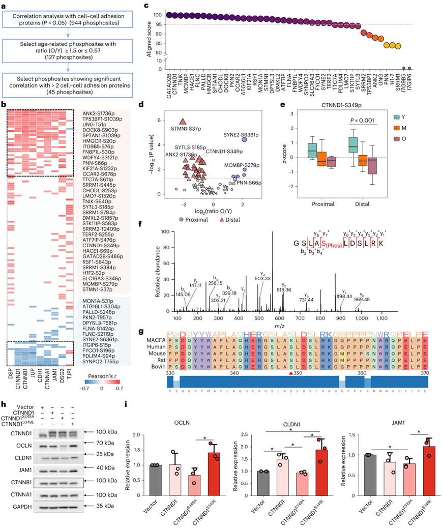 (a) 筛选可能影响细胞间粘附蛋白水平的年龄相关磷酸位点的流程图。(b) 热图显示 127 个年龄相关磷酸位点和 9 个细胞-细胞连接蛋白之间的相关性。(c) 通过CLUSTALW对猴子和人类之间对应于45个磷酸位点的43个蛋白质进行序列比对。 (d) 火山图显示年轻和年老猴子近端和远端结肠中 45 个磷酸位点的表达差异。(e) 箱线图显示近端和远端结肠中三个年龄组的CTNND1-S349p的水平。 (f) 在束状分枝杆菌样品中鉴定出的含有 CTNND1-S349p 的磷酸肽的 MS/MS 谱。(g) 不同物种间含有S349残基的CTNND1的部分氨基酸序列的比对。 (h) 免疫印迹分析。(i) 条形图显示通过密度测定法定量的 OCLN、CLDN1 和 JAM1 水平。