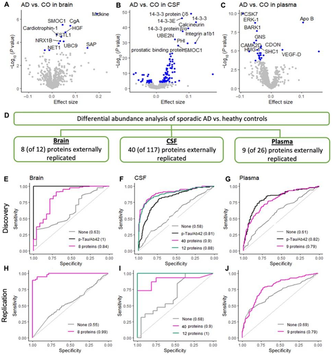 (A-C)火山图显示了差异丰度。(D)总结显示鉴定和外部复制的脑、脑脊液和血浆蛋白的数量。(E-J)受试者工作特征(ROC)曲线显示了外部复制蛋白(脑中8个,脑脊液中40个,血浆中9个)在区分AD患者和健康对照(CO)方面的表现。
