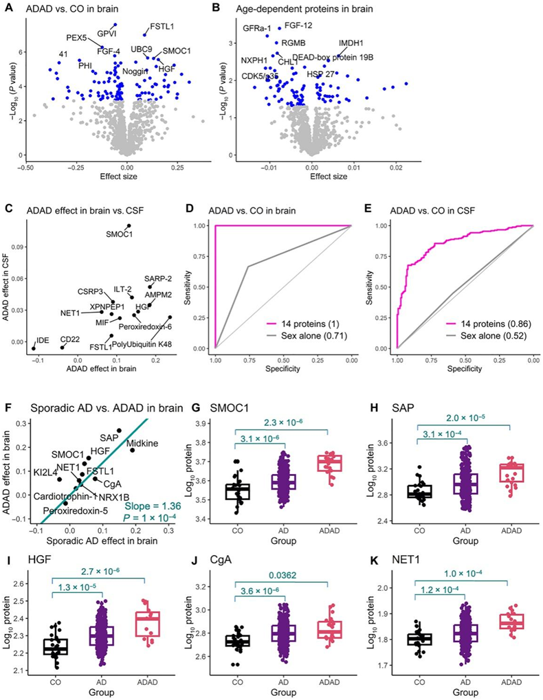 (A) 火山图显示ADAD 患者和健康对照 (CO) 个体之间大脑中蛋白质丰度(x轴)及显著性(y轴)。(B) 火山图显示大脑中蛋白质丰度分析(x轴)与依赖于年龄的统计显著性(y轴)的关系。( C到E ) CSF 中复制的 14 种蛋白质的散点图及其在大脑和 CSF中的预测模型。(F) 与散发性 AD 状态相关的 12 种蛋白质的散点图。(G-K) 选定的五种蛋白质(SMOC1、SAP、HGF、CgA 和 NET1)的箱线图。