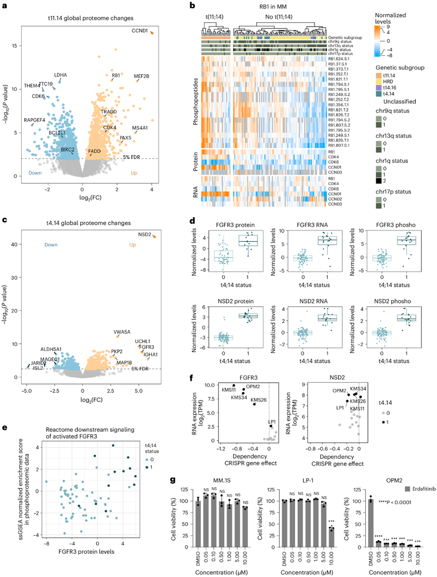 (a) 整体蛋白质水平。(b) 热图显示了 RB1、CDK4、CDK6、CCND1、CCND2 和 CCND3 在 RNA 和蛋白质水平以及 RB1 磷酸肽上的标准化表达。(c) 整体蛋白质水平。(d) FGFR3 和 NSD2 的蛋白质、磷蛋白和 RNA 表达水平 。(e) MM 样本中的 FGFR3 蛋白水平与 Reactome 基因集“磷酸化蛋白质组学数据中活化 FGFR3 的下游信号传导”的 ssGSEA 标准化富集分数。(f) FGFR3 和 NSD2 RNA 表达以及 CRISPR–Cas9 KO 筛选数据。(g) MM 细胞系的细胞活力。