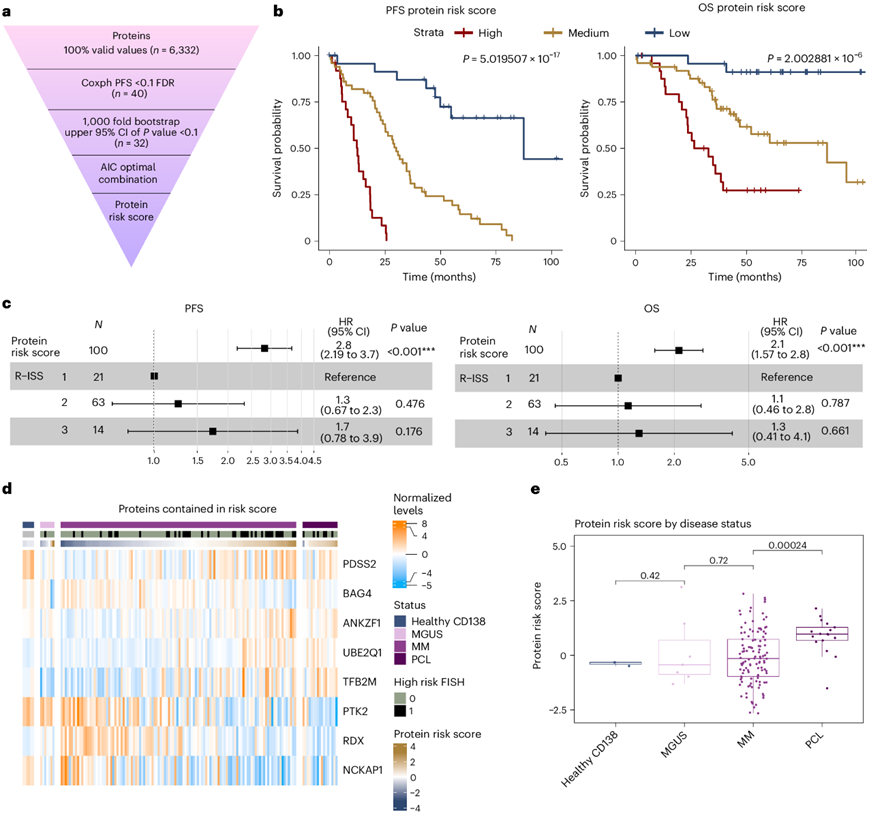 (a) 临床试验中接受以来那度胺为基础的强化治疗的 NDMM 患者的蛋白质组风险评分的生成工作流程。(b) 生存分析。(c) PFS 和 OS 的多变量 Cox 回归分析。(d) 健康供体、癌前 MGUS、MM 和 PCL 患者的样本中蛋白质高风险评分中所含蛋白质的表达。(e) 根据健康浆细胞、MGUS、MM 和 PCL 样本的蛋白质组数据计算的蛋白质风险评分值。
