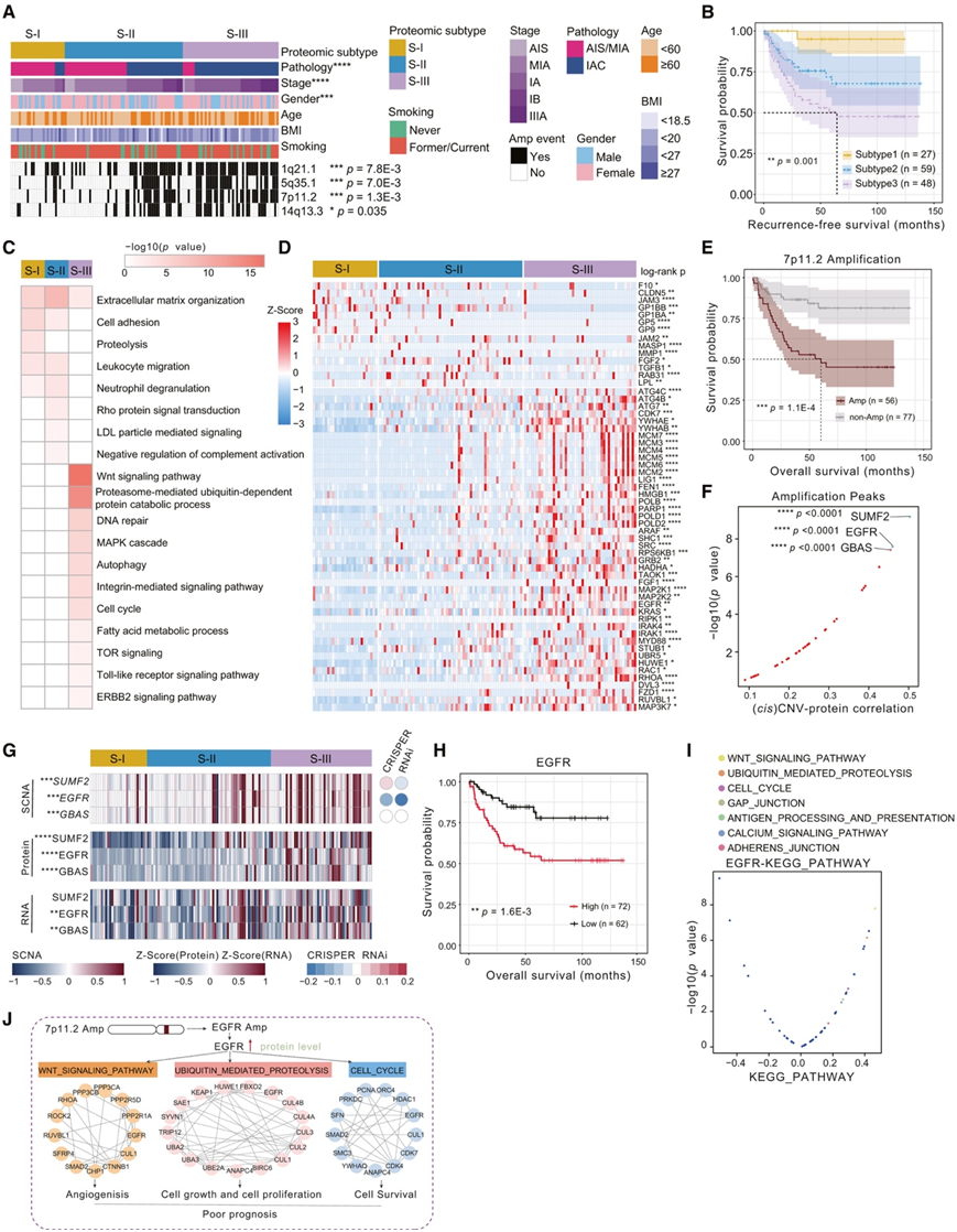 (A) 热图显示带有临床特征注释的蛋白质组亚型。(B) 比较不同蛋白质组亚型的无复发生存率的 Kaplan-Meier 图。(C) 三种蛋白质组亚型的富集通路。通过基因集变异分析(GSVA)计算富集分数。(D) 蛋白质组亚型之间差异表达蛋白质的热图。(E) Kaplan-Meier 图比较 7p11.2 扩增与否患者的OS。(F) 位于 7p11.2 的基因的拷贝数变异 (CNV)-蛋白质相关性。(G) 三种蛋白质组亚型中 SUMF2、EGFR 和 GBAS 的 SCNA、RNA 和蛋白质水平。(H) Kaplan-Meier 图比较按 EGFR 蛋白水平分层的患者的 OS。(I)与EGFR蛋白水平相关的富集通路。(J) 7p11.2 扩增通过EGFR上调促进肿瘤进展的工作模型。