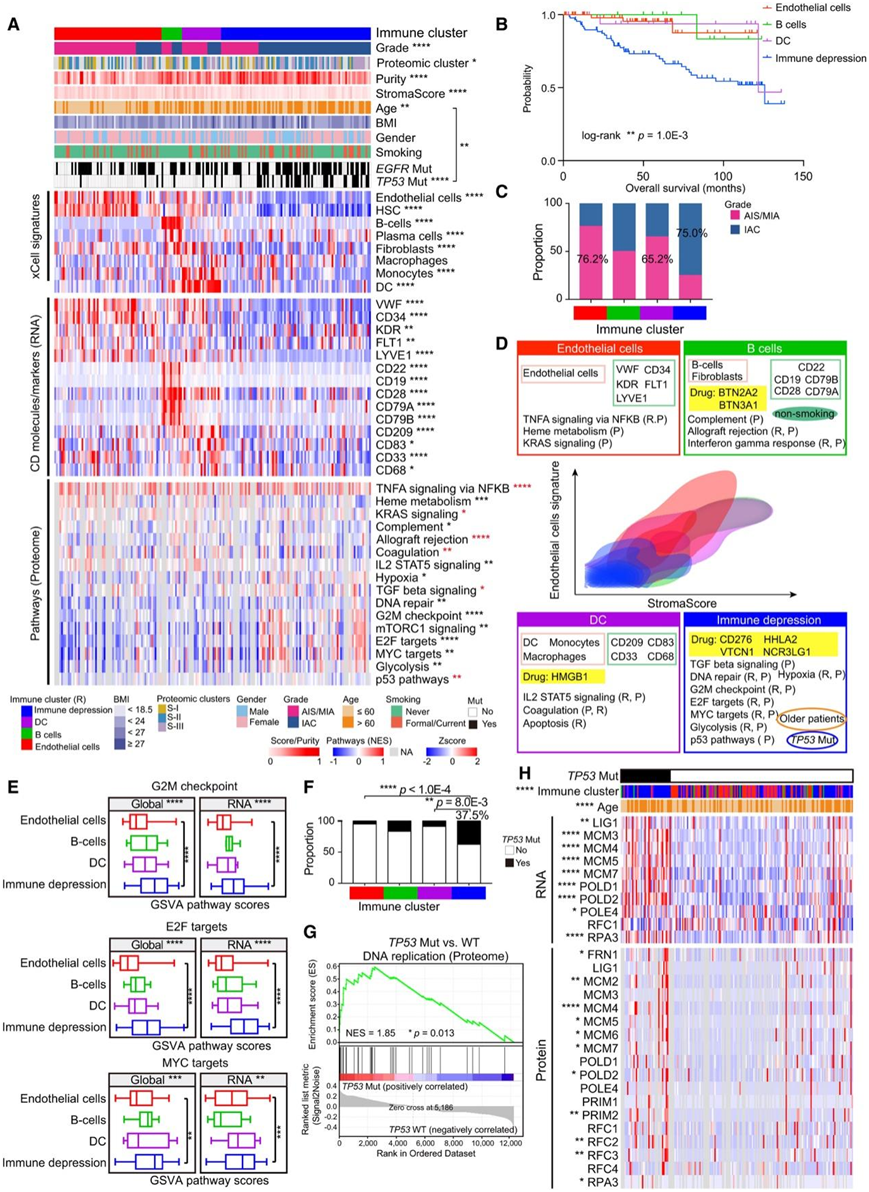 (A) 热图显示蛋白质组图谱,包括 xCell 特征、CD 分子 (RNA)、潜在可靶向的免疫检查点和四个不同免疫聚类中的富集通路(蛋白质组)。(B) 比较四个免疫聚类的OS的 Kaplan-Meier 图。(C) 四个免疫聚类中 AIS/MIA 和 IAC 的比例。(D) 基于基质评分和内皮细胞特征的密度等高线图。(E) 基于四个免疫聚类中的蛋白质组和转录组数据,通过GSVA计算出的 G2M 检查点和 E2F 靶信号转导富集分数的分布。(F)四个基于 RNA 的免疫聚类中TP53突变的比例。(G) 基于按TP53突变状态分层的蛋白质组数据的GSEA。(H) 根据TP53突变分层的 DNA 复制和碱基切除修复基因中 RNA 和蛋白质的分子谱。
