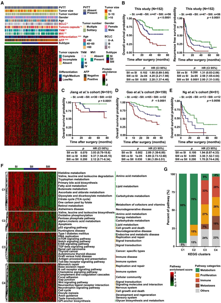 无监督共识聚类在152例HCC患者中鉴定出三种蛋白质组学亚型,分别为SI (n = 49)、SII (n = 47)和SIII (n = 56)(图1A)。此外,三种蛋白质组亚型在总生存期(OS)和无复发生存期(RFS)方面存在显著差异(图1B)。在公开的队列中进一步验证了这三个蛋白质组学亚型,这支持了本项研究的蛋白质组学亚型的可靠性(图1C-E)。与目前临床特征一致的是,SIII比SI更突出BCLC晚期和TNM期、α-胎蛋白(AFP)阳性、显微血管侵犯(MVI+)、肿瘤低分化、多个肿瘤数目、肿瘤包膜缺失等特征(图1A)。