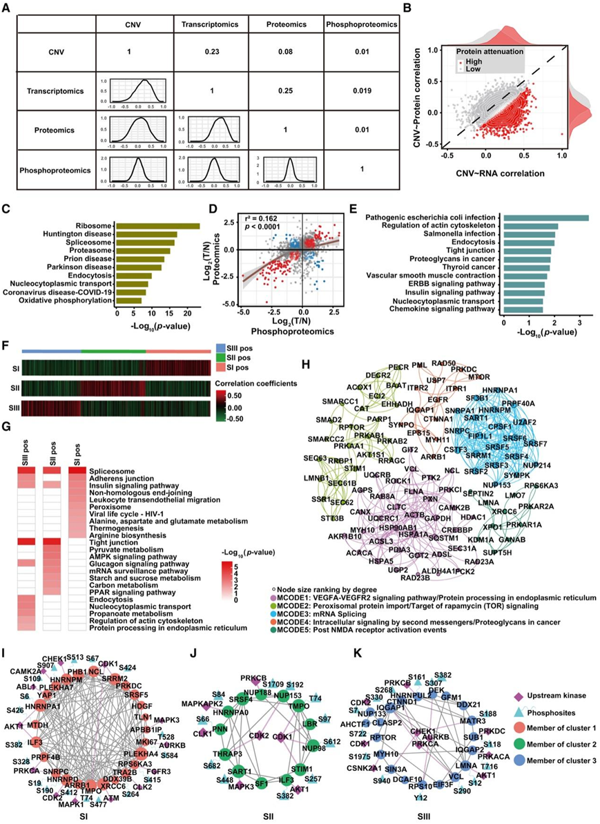 (A) WES、转录组、蛋白质组和磷蛋白质组之间的相关性。(B) CNV 与 mRNA 和蛋白质的 Spearman 相关性。(C) 减毒蛋白的富集的KEGG通路分析。(D) 散点图描绘蛋白质(x 轴)和磷蛋白(y 轴)丰度。(E) 富集 (D) 中负相关蛋白的 KEGG 通路。(F) 三种蛋白质组亚型之间显著变化的磷酸位点与蛋白质相关性的层次聚类分析图。(G) 每个聚类中显著的磷酸位点与蛋白质相关性的功能富集。(H) 三种蛋白质组亚型之间磷酸位点与蛋白质相关性显著改变的磷酸位点与蛋白质共变 MCODE/子网。(I–K) SI、SII和 SIII阳性中最重要的特定 MCODE 与上游激酶结合。