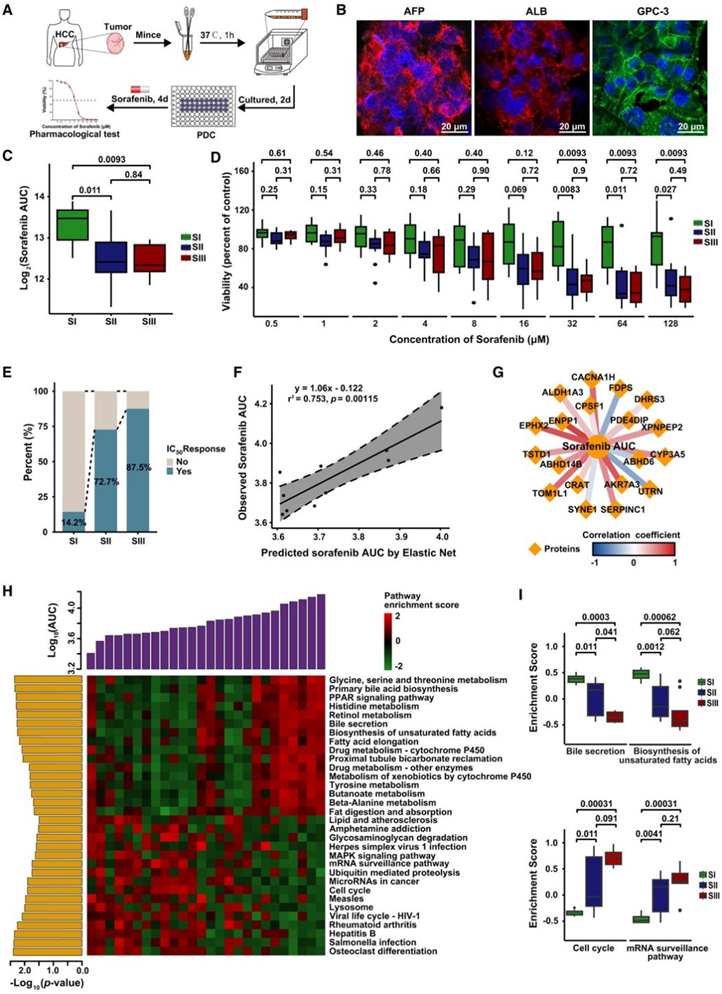 (A) 使用 PDC 模型的药理测试工作流程。(B) PDC 的免疫荧光。(C) 三种蛋白质组亚型中 PDC 模型的索拉非尼敏感性结果。(D) 三种蛋白质组亚型不同浓度下索拉非尼PDC模型的敏感性结果。(E)三种蛋白质组学亚型中达到IC50的患者比例。(F)验证集中弹性网络预测和观察到的AUC之间的相关性。(G) 索拉非尼敏感性预测模型中选定蛋白质特征的调节网络。(H) PDC 模型中富集通路与观察到的 AUC 之间的相关性。(I) 三种蛋白质组亚型中与索拉非尼敏感性相关的通路的富集。