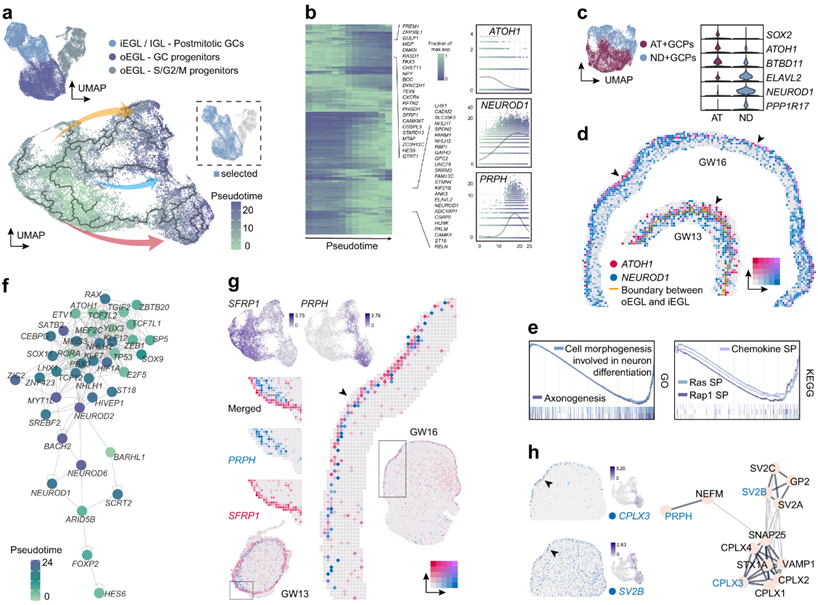 (a) 细胞周期不同阶段 GC 谱系的可视化(上)。G1 期 GC 祖细胞和有丝分裂后 GC 的 UMAP可视化(下)。(b) 不同基因沿伪时间的表达模式发生改变。(c) AT+GCP 和 ND+GCP 的可视化(左)和显示其标记基因表达模式的小提琴图(右)。(d) 空间基因表达模式显示ATOH1和NEUROD1在人小脑 GW13 和 GW16 EGL 中的独立表达。(e) AT+GCP 与 ND+GCP 中通路富集图。(f) GC 发育的 GRN。(g) scRNA-seq 和空间 RNA-seq 数据中SFRP1和PRPH的基因表达模式。(h) CPLX3和SV2B在 GW16 的空间基因表达模式,箭头突出显示 EGL 中的富集(左)。根据 STRING 的蛋白质相互作用网络(右)。