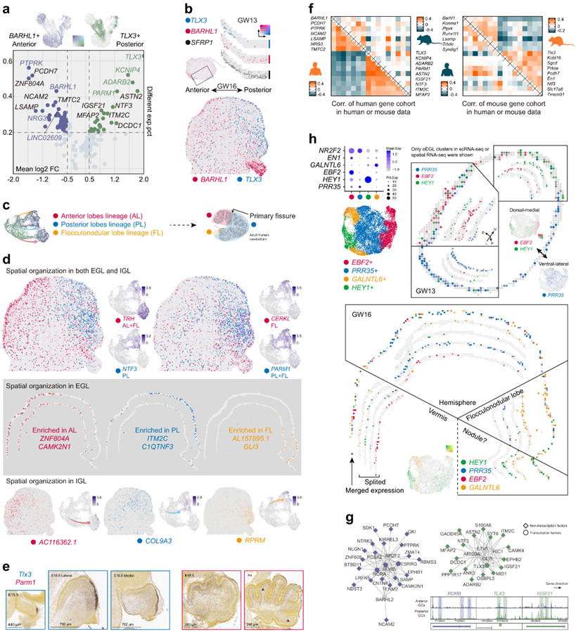 (a) GC 谱系中BARHL1和TLX3的基因表达模式(上)。显示互补表达基因组的火山图(下)。(b) GW13(上)和 GW16(下)前部区域BARHL1和后部区域TLX3的空间基因表达模式。(c) 对应于人类小脑三个叶的三个 GC 亚系的示意图。(d) EGL 和 IGL 中 GC 亚系的空间组织。(e) 小鼠 E15.5 和 E18.5 的Tlx3和Parm1原位杂交结果。(f) 人类和小鼠数据集中人类(左)或小鼠(右)基因组的相关性,显示物种特定的空间基因表达模式。(g) GRN 显示前部(蓝色)或后部(绿色)特定基因(左上)的潜在调控程序以及不同基因中可访问区域的可视化(右下)。(h) scRNA-seq 数据中 GC 祖细胞四种亚型的可视化及其标记基因的表达(左上)。GW13 的 oEGL 中PRR35、EBF2和HEY1的空间分布(右上)。GW16 的 EGL 中HEY1、PRR35、EBF2和GALNTL6的空间分布(下)。