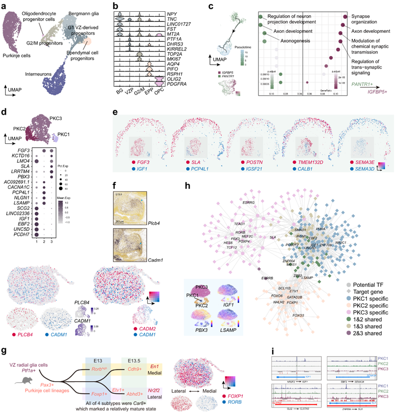 (a) 不同祖细胞、GABA 能神经元和神经胶质细胞的可视化。 (b) 小提琴图显示(a)中细胞类型标记基因的表达模式。(c) 从 VZ 祖细胞到中间神经元的伪时间轨迹(左上)。PANTR1和IGFBP5的基因表达模式(左下)。PANTR1 +和IGFBP5 +中间神经元的富集结果(右)。 (d) 三种 PKC 亚型的可视化(上)和显示标记基因相应表达模式的点图(下)。(e) GW16 Stereo-seq 揭示的 PKC 多维空间基因表达模式以及 scRNA-seq 揭示的相应基因表达模式。(f) scRNA-seq 和 GW13 Stereo-seq 揭示的 PKC 中PLCB4、CADM1和CADM2的基因表达模式(下)。E15.5 小鼠中Plcb4和Cadm1的原位杂交结果(上)。(g) 小鼠 PKC 发育进展示意图(左)。FOXP1和RORB在人 GW13 小脑中沿 LM 轴的表达(右)。(h) GRN 显示不同 PKC 亚型的潜在调控程序(右上)。scATAC-seq 数据中无监督聚类的可视化及其标记基因的分数,其中蓝色代表低水平,黄色代表高水平(左下)。(i) 三种 PKC 亚型中不同基因的可及区域的可视化。