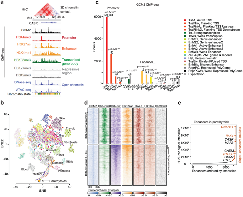 (a) 本研究中生成的精选表观基因组图谱列表,例如CASR基因。(b) 基于甲状旁腺特异性表达的 8 个甲状旁腺腺瘤样本的 RNA-seq 的 t-SNE 投影以及来自GTEx项目中分析的53个组织的RNA-seq样本,其中每个点代表每个样本,每种颜色代表每种组织类型。 (c) GCM2结合的分布映射到甲状旁腺中的染色质状态。 (d) 热图显示GCM2峰周围的组蛋白修饰模式。(e) 甲状旁腺的超级增强子。