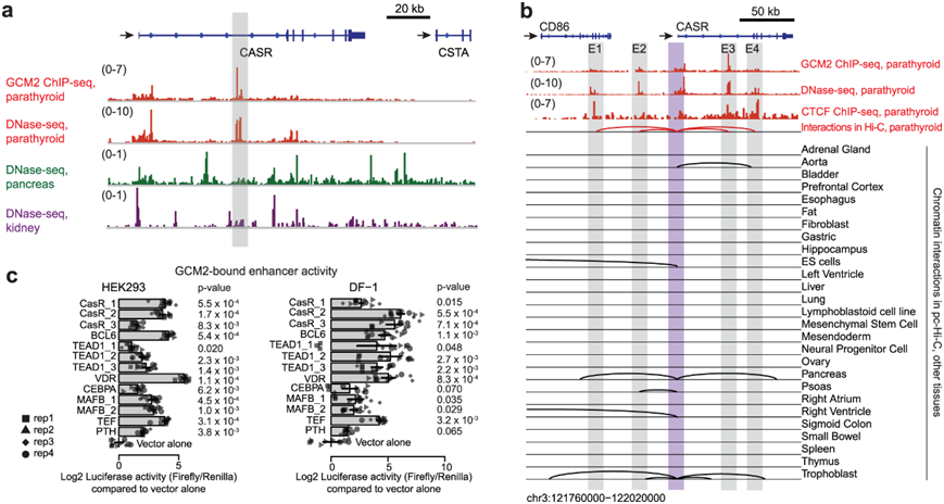 虽然CASR在调节PTH分泌的甲状旁腺中高表达,但它也在许多其他组织中表达,如调节钙重吸收的肾脏和控制胰管液体分泌的胰腺。CASR的表达水平在不同组织间存在差异,这种差异可能是由于增强子特征差异引起的。为了揭示这些细胞类型特异性机制,他们在表达CASR的组织中检测了dna酶I超敏(DHS)位点(图2a)。他们在CASR的内含子区发现了突出的DHS峰,特别是在甲状旁腺。在肾脏或胰腺中没有发现它们。这些甲状旁腺特异性DHS峰也与GCM2结合,这表明CASR内含子中的这些增强子元件可能是甲状旁腺功能的基础(图2a)。