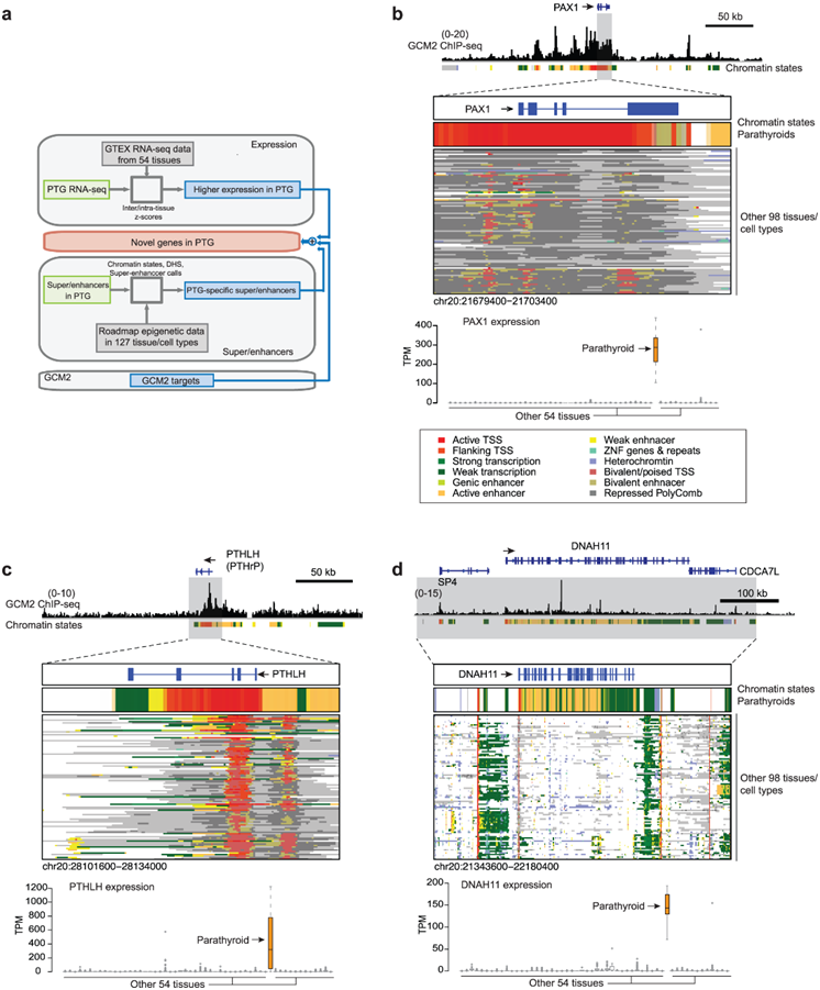 (a) 通过整合表达、增强子和GCM2结合数据,鉴定先前未识别的可能在甲状旁腺中起关键作用的基因。(b) PAX1的GCM2结合和染色质状态(上)。表观基因组路线图(中)显示甲状旁腺和其他组织中PAX1位点的染色质状态,甲状旁腺和其他组织中的表达水平(下)。(c) 与(b)相同,但PTHLH在许多组织类型中表达。(d) 与(b)相同,但针对DNAH11。