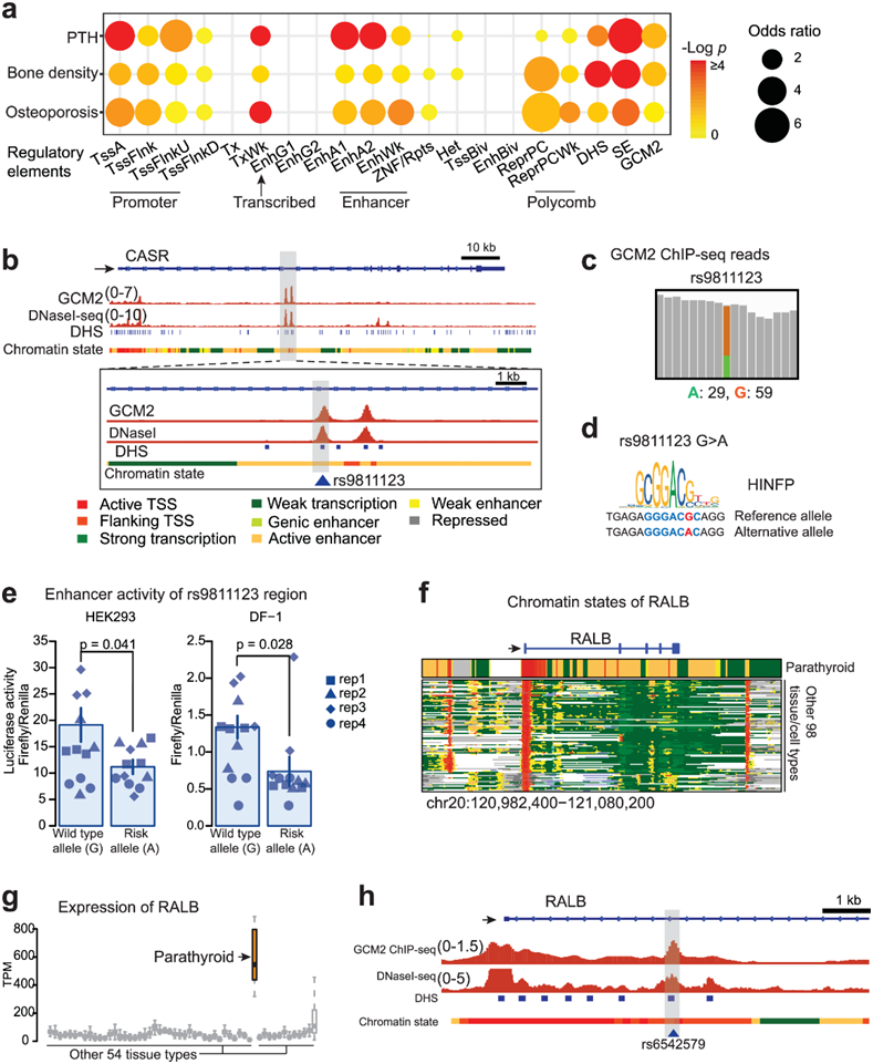 (a) 甲状旁腺调节元件中 PTH 水平、骨密度和骨质疏松症的 GWAS SNP 富集。(b) CASR 甲状旁腺特异性内含子增强子中与 PTH 水平相关的 SNP (rs9811123) 。(c) SNP rs9811123 的读数分析。(d) rs9811123 周围的HINFP基序序列,预测了 SNP 的结合亲和力变化。(e) 通过荧光素酶测定在 HEK293 和 DF-1 中检测SNP 的影响。 (f) RALB基因周围的染色质状态。(g) RALB跨组织类型的表达水平。(h)RALB 甲状旁腺特异性内含子增强子中与 PTH 水平相关的 SNP (rs6542579)。