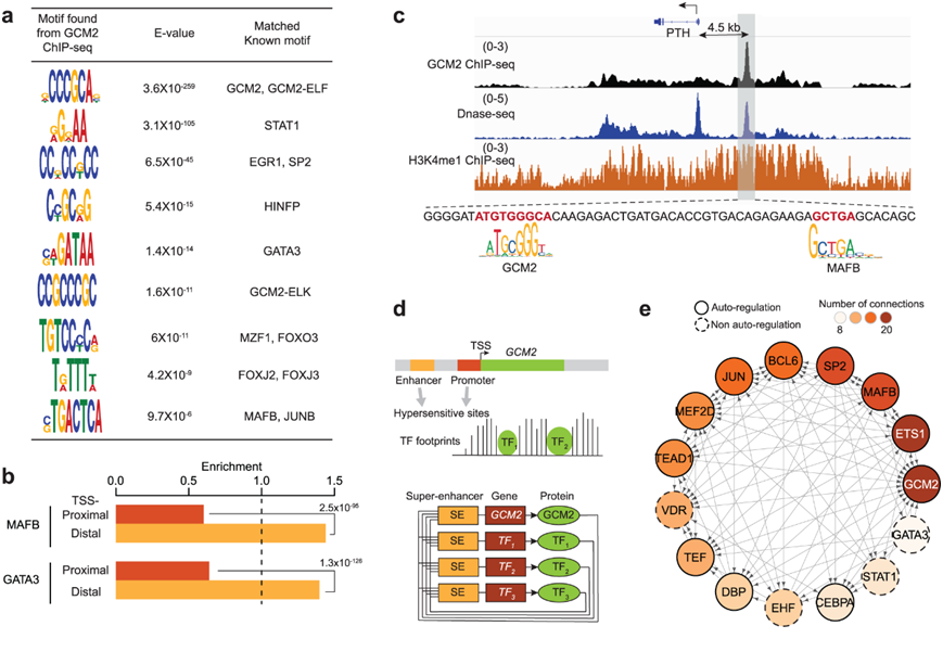 (a) 来自GCM2峰的基序序列与已知的 TF 基序相匹配。(b) MAFB和GATA3的 TSS 近端区域(红色)和 TSS 远端区域(橙色)的结合预测富集。(c) 预测的PTH基因远端增强子(距离 TSS 4.5 kb)处的GCM2和MAFB结合位点。(d) 识别与GCM2配合使用的关键 TF 调节子的示意图。(e) 甲状旁腺中的核心 TF 调节回路。