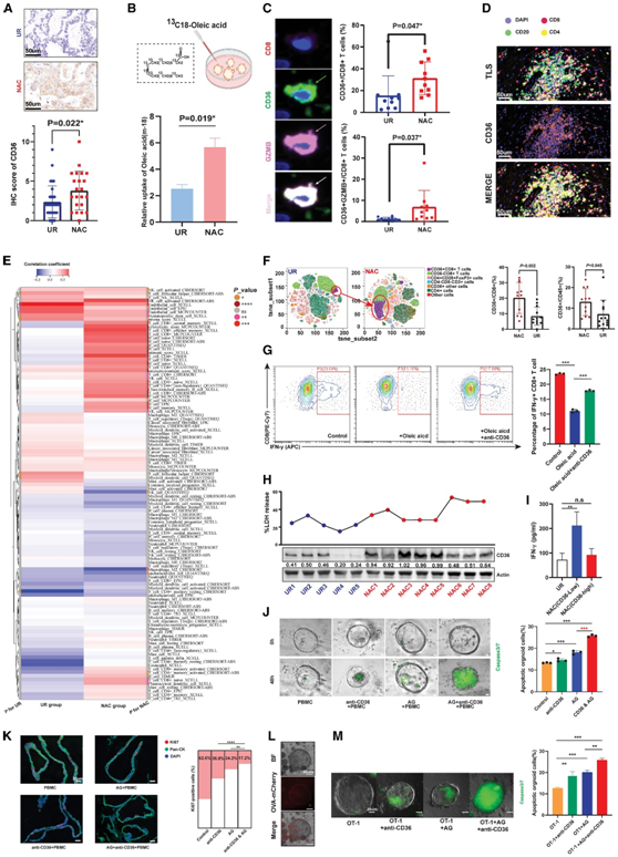 (A) 免疫组织化学染色分析。(B) 代谢通量分析。(C)在用 NAC 处理的 PDAC 中, CD36 + CD8 + T 细胞和 CD36+ GZMB+ CD8+ T 细胞的百分比显著上调。(D) 免疫荧光代表性图显示 CD36 和 TLS 在 PDAC 中的共定位。(E) 热图显示 CD36 表达与免疫细胞浸润之间的相关性。(F) t 分布随机邻域嵌入 (t-SNE) 分析。(G)流式细胞分析。(H) LDH 释放实验表明,用不同 PDAC 样品的裂解物处理的 T 细胞表现出不同的肿瘤杀伤能力。(I) 与 UR 样品相比,用 CD36-low NAC 样品裂解物处理的 T 细胞显示出显著更高的 IFN-γ 分泌。(J) Caspase3/7 检测分析。(K) mIF 显示 CD36 阻断增强了 AG 的杀伤效果。(L) 成功构建卵清蛋白 (OVA+) 鼠 KPC 类器官。(M) OVA+类器官/OT-1 细胞共培养系统验证了 CD36 阻断对 AG 介导的肿瘤杀伤的协同作用