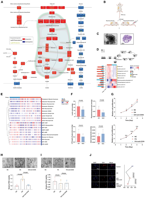 (A) 转录组和蛋白质组分析揭示了与 AG 治疗相关的代谢酶的变化。(B)构建 PDX模型。(C) 在显微镜明场中的代表性图。(D) 代谢流实验显示出较低的糖酵解活性。(E) 基于 RNA-seq 数据(scFEA 算法)比较 AG 组和对照组之间的代谢通量。(F) 靶向代谢组学分析显示,含有和不含 NAC 后的 PDAC 样品之间的乳酸、3-PD、磷酸烯醇丙酮酸和 α-酮戊二酸存在差异,这意味着 NAC 与 PDAC 中糖酵解活性下调相关。(G) CCK-8实验分析。(H-I) 根据活力测定,发现油酸与棕榈酸相反,可以增强 PDO 的生长。(J) EdU 分析显示油酸可能会加剧对 AG 的耐药性,但可以通过靶向 CD36 来阻断。