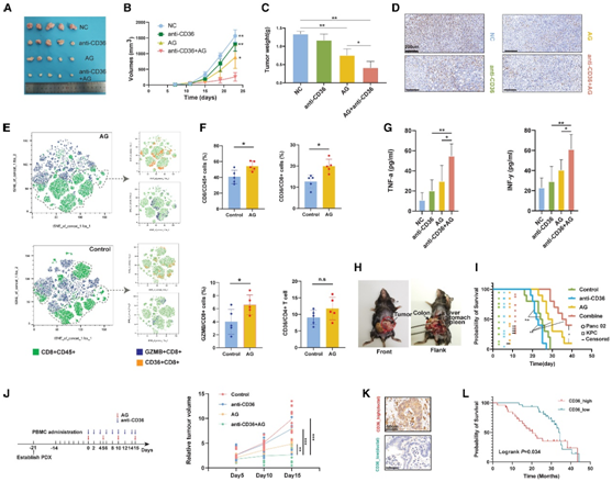 (A) 每组皮下异种移植鼠 PDAC 肿瘤模型(C57 小鼠)的视觉呈现。(B) 肿瘤体积的分析。(C) 肿瘤重量的分析。(D) 代表性 IHC 染色显示用不同方案处理的皮下异种移植物中 Ki67 的表达。(E) t 分布随机邻域嵌入 (t-SNE) 分析显示 CD36 + CD8 + T 细胞和 GZMB + CD8 + T 细胞的聚类。(F) 流式细胞分析。(G) ELISA 结果分析。(H) PDAC 原位小鼠模型的代表性图像。(I) Kaplan-Meier 曲线分析。(J)在人源化PDX模型中,CD36阻断与AG方案协同作用可显著缩小PDAC肿瘤大小。(K) CD36 高和低 PDAC 的代表性 IHC 染色图像。(L) Kaplan-Meier 曲线显示 CD36 表达增加预示接受 AG 辅助化疗的 PDAC 患者预后较差。