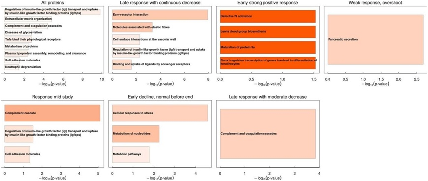 图3. 禁食期间血浆蛋白水平的时间轨迹。总共 1034 个蛋白质靶标在研究过程中表现出显著变化。