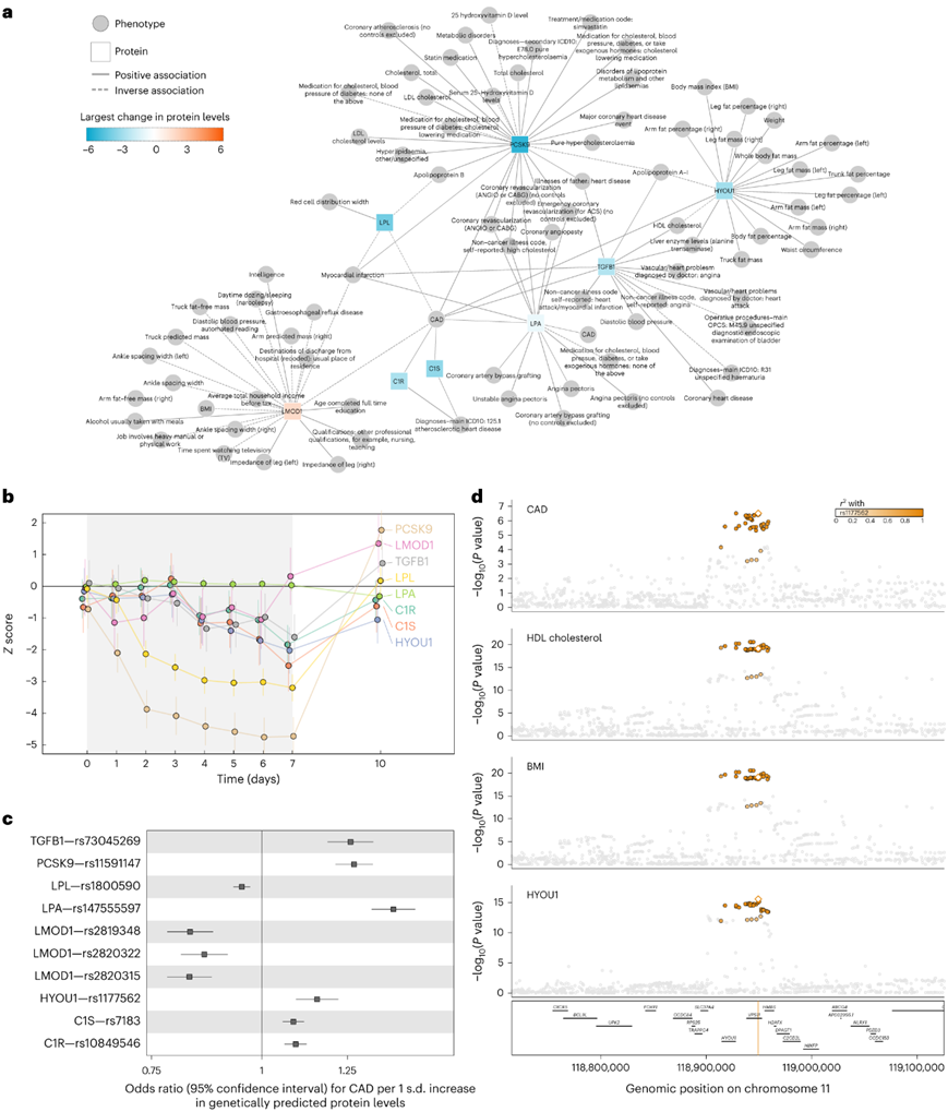 (a) 以 CAD 为中心的基因推断蛋白质疾病网络。 (b) 研究期间目标蛋白的时间轨迹。 (c) 根据蛋白质编码位点中的主要遗传变异来估计遗传易感性对较高蛋白质水平对 CAD 风险的影响的优势比。(d) 全基因组关联研究中HYOU1的共有遗传信号在HYOU1、BMI、HDL 胆固醇和 CAD 血浆水平之间的区域关联图。