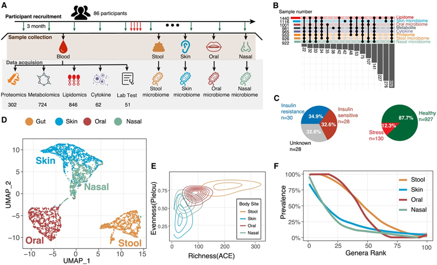 (A)研究设计。(B)不同组学类型的样本数重叠。(C)应激、胰岛素抵抗和健康样本的比例。(D)微生物组样品按身体部位的均匀流形近似和投影(UMAP)。(E)微生物群落丰富度和均匀度的密度分布。(F)每个身体部位纵向患病率最高的100个微生物群属的排名流行曲线。