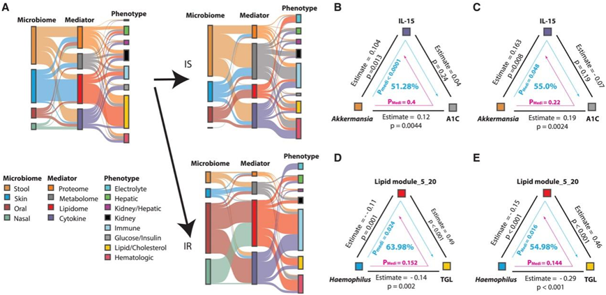 (A)微生物组和表型中介分析。(B) Akkermansia通过血浆IL-15对血红蛋白A1C水平的调节作用。(C) Akkermansia对胰岛素敏感个体血红蛋白A1C水平的调节作用。(D) Haemophilus对血浆甘油三酯水平的调节作用。 (E) Haemophilus对胰岛素敏感个体血浆甘油三酯水平的调节作用。