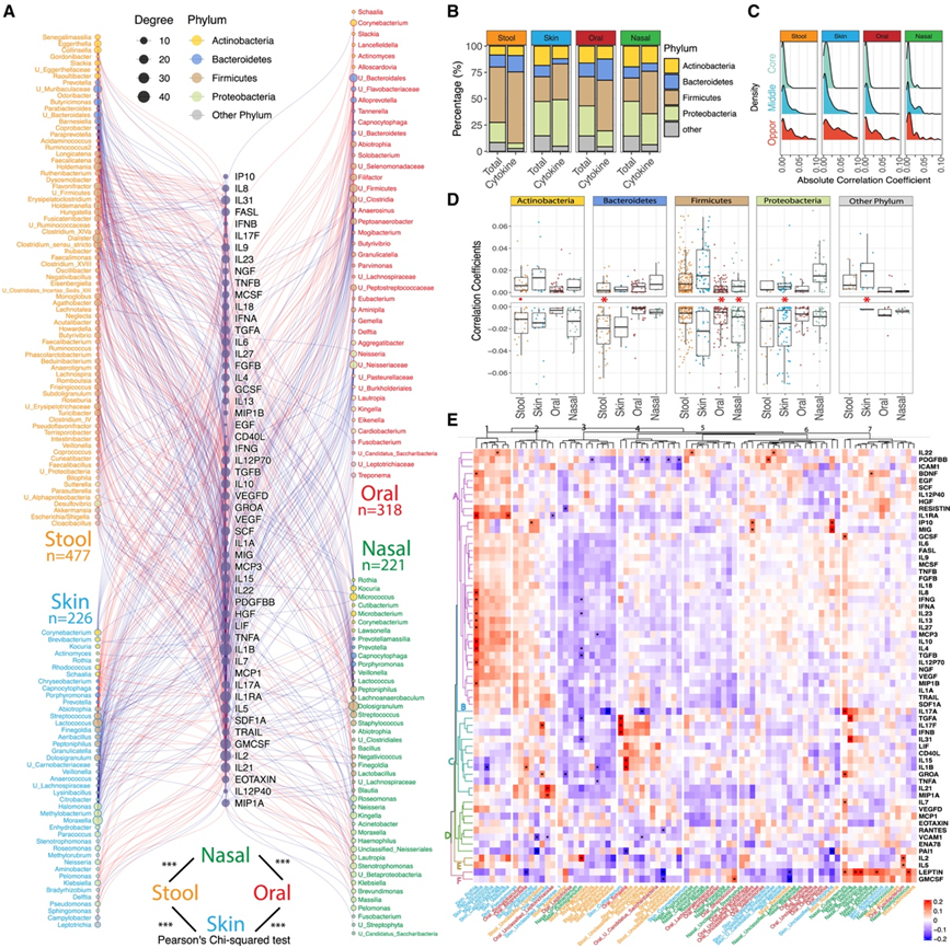 微生物稳定性的动态变化可能与多种宿主调节机制有关,特别是免疫系统。利用贝叶斯模型,他们研究了在所有4个身体部位,62个宿主循环细胞因子/趋化因子、生长因子和微生物组丰度之间的纵向相互作用。基于可信区间,确定了477个粪便、226个皮肤、318个口腔和221个鼻腔中具有身体部位特异性的显著微生物组-细胞因子关联(图4A)。粪便和口腔微生物组显示出比皮肤和鼻腔微生物组更广泛的微生物组相互作用谱(图4A)。有趣的是,与上皮/内皮生长和血管炎症相关的细胞因子(即表皮生长因子[EGF],血管细胞黏附分子[VCAM]-1和白细胞介素[IL]-22)、IL-1家族成员(即IL-1b和IL-1Ra)和瘦素与微生物组的相互作用最多。他们进一步确定了一个细胞因子亚群,包括IL-1b、IL-1Ra、MCP3(趋化因子配体[CCL] -7)和IL-23是通过效应量与微生物组最强的相关细胞因子。