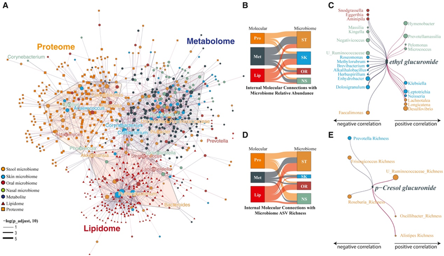 有趣的是,微生物组-宿主分子相互作用网络根据微生物组的内部分子组成而不是身体部位进行划分(图5A),这表明某些分类群主要受内部分子相互作用的影响,而不是影响宿主分子组成。值得注意的是,三种肠道类型驱动分类群:拟杆菌、普雷沃氏菌和未分类的瘤胃球菌科,分别表现出对脂质组、蛋白质组和代谢组区域的明显偏好(图5B)。已证实普雷沃菌与蛋白质之间的密切关系以及拟杆菌与脂类之间的关系。许多类群-分子相互作用在整个身体部位是一致的,皮肤微生物组在微生物-脂质组关联中表现出最广泛的连通性,而粪便微生物组主要与代谢组和蛋白质组相关(图5B)。本项研究表明,多种代谢物(如酒精相关代谢物葡糖醛酸乙酯)与身体所有4个部位的微生物组相互作用,这表明酒精在肠道和口腔微生物组之外具有更全面的影响。值得注意的是,以产生乙醛和乙醇的潜力著称的皮肤奈瑟菌属和克雷伯菌属与血浆葡糖醛酸乙酯水平呈正相关(图5C)。而对酒精敏感的产醋酸菌Faecalimonas则与乙基葡萄糖醛酸呈显著负相关。