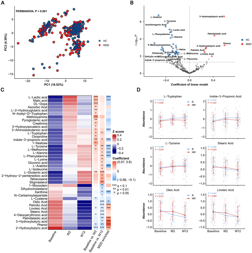 (A) 基于血浆代谢组学特征的主成分分析 (PCA) 显示 MDD 患者和 HC 患者的血浆代谢特征之间存在显著差异。(B) MDD 患者和 HC 之间代谢物水平差异回归系数的火山图。(C) 热图显示 41 种血浆代谢物的平均丰度,根据线性混合模型 (LMM) 确定。(D) 6 种血浆代谢物的纵向变化,表现出 R 组和 NR 组之间的差异趋势。
