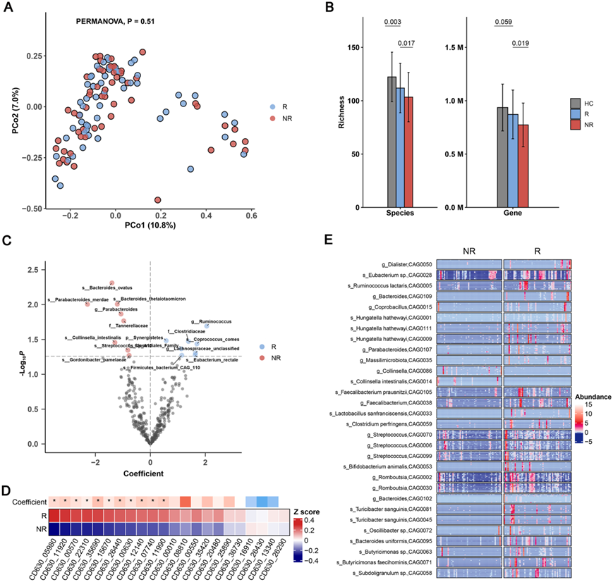 (A) PCoA分析。(B) 以 HC 为参考,R 组和 NR 组基线时微生物物种(左)和基因(右)丰富度差异。(C) 缓解组肠道微生物物种回归系数的火山图。(D) 热图显示了 22 个孢子形成基因的平均丰度,其中 11 个在 R 组中富集,由多元回归模型确定。(E) 基线时 R 组和 NR 组之间差异丰度基因的共丰度组 (CAG) 热图。