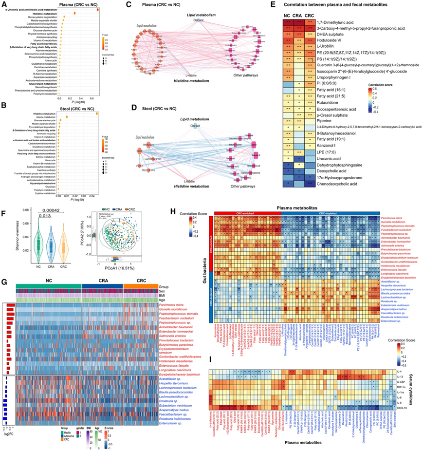 (A-B) 通过代谢物富集分析确定了 CRC 与 NC 相比血浆或粪便差异代谢物的功能通路。 (C-D) CRC 与 NC 相比的血浆或粪便代谢物之间的相关网络。(E) CRC 进展阶段中差异血浆和粪便代谢物之间的相关性。(F)粪便样本的辛普森多样性和 PCoA 分析。(G)差异肠道微生物热图。(H) CRC 与 NC 中差异血浆代谢物和肠道微生物之间的相关性。(I)差异血浆代谢物和细胞因子之间的相关性。