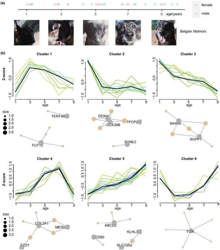 (a) 三十只比利时玛利诺犬用于转录组基线。(b) 鉴定出 61 个与年龄相关的基因,这些基因分为具有不同模式的 6 个聚类。