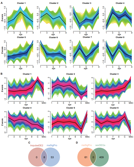 (A)跨越年龄的所有基因聚类。(B) 细胞间充质干细胞处理后的所有基因聚类。(C) 两种年龄相关基因鉴定方法的维恩图。(D) 年龄相关基因和性别基因的维恩图。