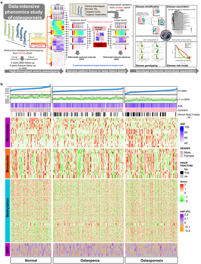 研究团队利用来自中国社区骨质疏松症队列 (CCCO) 的 366 个样本,构建了迄今为止最大的骨质疏松症队列的第一个多组学图谱(图1a-b)。这些生物大数据包括用于基于遗传和环境因素全面表征骨质疏松风险的基因组学、表观基因组学和宏基因组学数据(图1a-b)。他们首先通过高效的深度潜在空间融合(DLSF)分析,基于多组学景观和相应的多模式分子特征(M3S),识别了中国人群中的临床干预相关亚型(CIS),并且CIS在临床过程中表现出不同的敏感性。