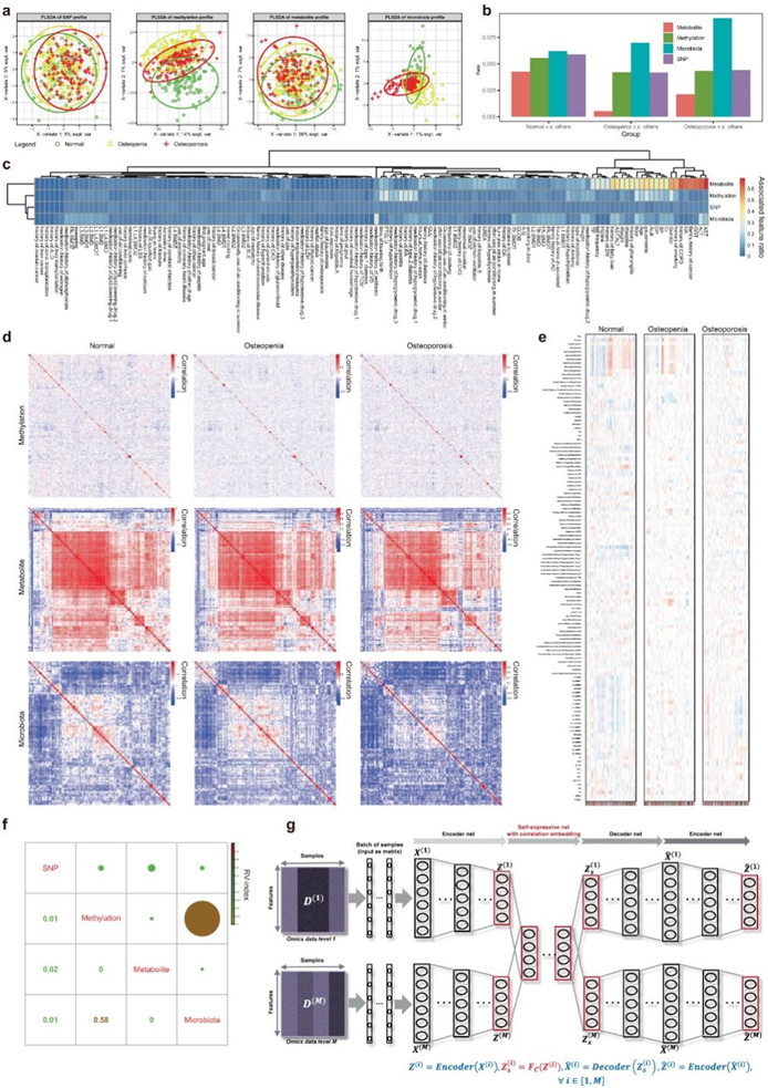(a) PLSDA 空间中的样本组分布。(b) 不同组学数据级别的区分特征的百分比。(c) 不同组学数据级别的表型相关特征的百分比。 (d) 不同样本组在相应组学数据水平上的特征共表达网络。(e) 特定组学数据水平上不同样本组的特征及其表型关联的共表达网络模块。(f) 通过 RV 指数估计的不同组学数据集之间的共有信息。 (g) 基于联合自动编码器和自我表达技术的深层潜在空间融合模型,用于骨质疏松症多组学图谱的多组学无监督学习。