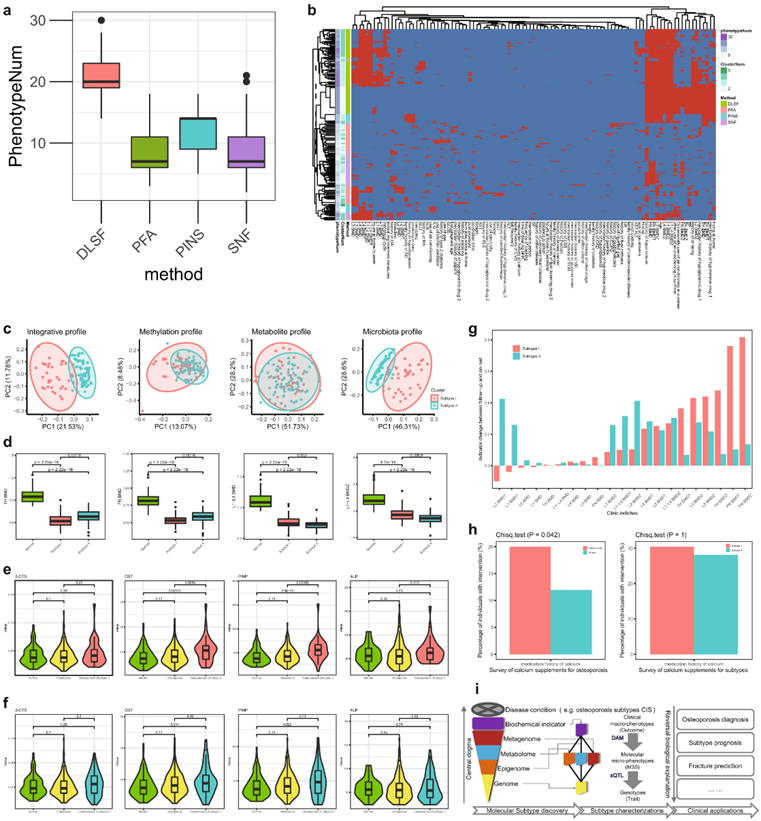 (a) 基于表型关联数量的 DLSF 和其他模型的效率评估。(b) DLSF 和其他模型的稳健性评估。 (c) 不同组学数据水平显示的综合骨质疏松症亚型及其判别空间。(d) 与骨质疏松症相关的几种表型和两种已确定的亚型(I 型和 II 型)。(e-f) 分别表示正常、骨质减少和骨质疏松亚型 I 和亚型 II 之间的 BTM 差异。 (g) 亚型 I 和亚型 II 的两年随访评估。 (h) 骨质疏松病史调查,表明接受特定医疗干预(例如钙补充剂)的个体百分比,以及骨质疏松症与其他疾病之间或两种骨质疏松症亚型之间的分布差异。 (i) 骨质疏松症及其亚型的分析流程。