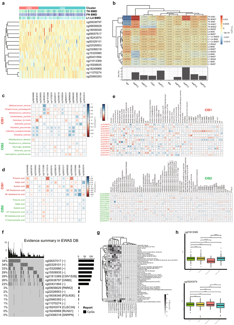 (a) 甲基化特征的CpG。(b) EWAS 结果摘要。 (c) 甲基化和微生物特征之间的亚型特异性关联矩阵。(d) 甲基化和代谢特征之间的亚型特异性关联矩阵。(e) 甲基化特征和临床表型之间的亚型特异性关联矩阵。(f) 有关 EWAS DB 中甲基化特征的公开数据。(g) 公开报道的与甲基化特征相关的表型。(h) 几个代表性的甲基化特征,表明骨质疏松症及其亚型。