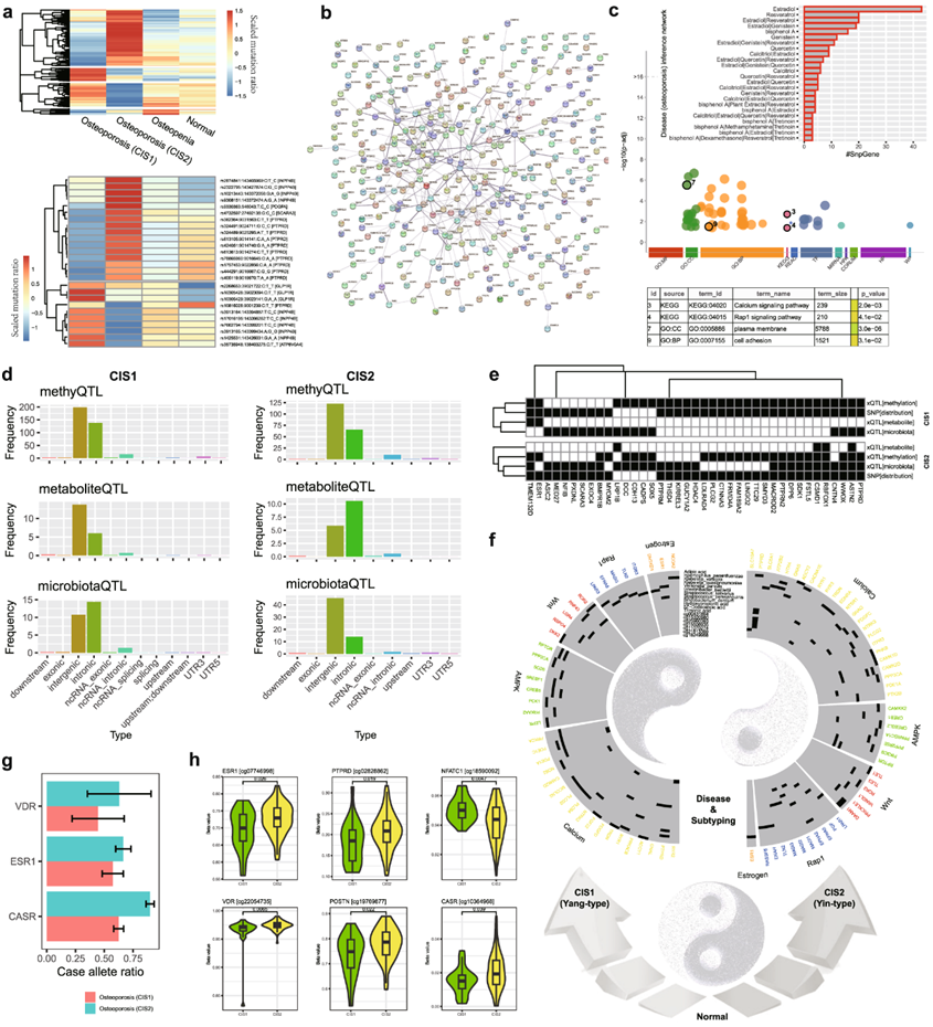 (a) 骨质疏松症亚型的整体 SNV 模式。(b) 整体snpGenes之间的蛋白质关联网络。(c) 整体snpGenes的功能富集。(d) 不同骨质疏松症亚型对应的 xQTL SNP 的 SNV 类型偏好。(e) xQTL 模型中不同 QTL 之间共有和特定的局部 snpGene。 (f) “阴-阳”骨质疏松亚型,其特征在于亚型特异性基因型-分子表型关联。 (g) 代表性钙相关基因的等位基因频率。(h) CIS 之间的甲基化差异,以少数钙和骨质疏松相关基因为例。
