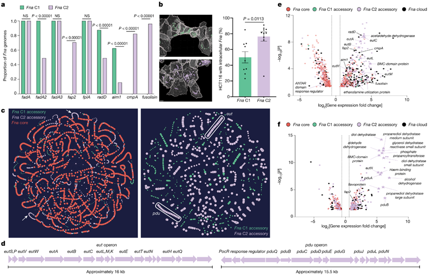 (a) 基因存在与不存在的柱形图,描绘了包含典型Fn毒力因子的Fna基因组的比例。(b) 左:对与代表性Fna C1(绿色)或Fna C2(淡紫色)菌株共孵育的结肠癌上皮细胞(HCT116;灰色)进行计算共聚焦分析。右:显示具有细胞内Fna的 HCT116 细胞百分比的条形图。 (c) Fna全基因组的PPanGGOLiN图谱。(d) Fna C2 操纵子的示意图。(e-f)差异表达基因分析。