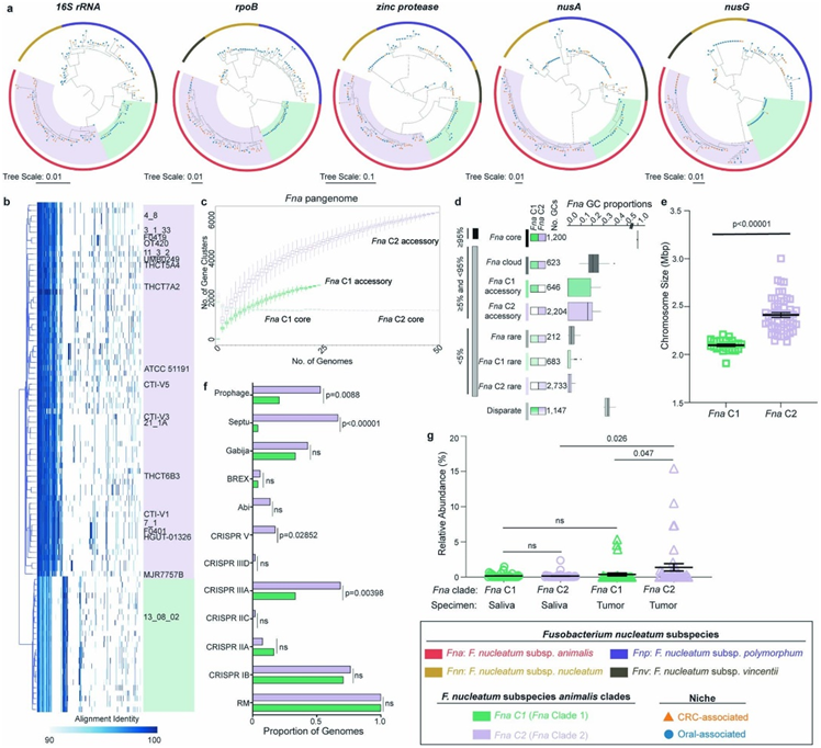 (a) Fn单标记基因、16S rRNA、rpoB、锌蛋白酶、nusA和nusG的最大似然系统发育树。(b) Fna基因组中蛋白质编码基因内容的GiG-map可视化。(c) 按Fna进化枝、Fna C1(绿色)和Fna C2(淡紫色)划分的Fna全基因组大小,并标记了各自的核心和辅助基因组。(d) 按进化枝划分的Fna全基因组子集的组成。 (e) 柱形图表示Fna C1 和Fna C2中的染色体大小。 (f) 柱形图显示包含先天细菌遗传防御系统子集的Fna基因组的比例。 (g) 图表显示来自 39 名结肠直肠腺癌患者的配对唾液(圆形)或肿瘤活检(三角形)样本中Fna C1(绿色)和Fna C2(淡紫色)的相对丰度百分比。
