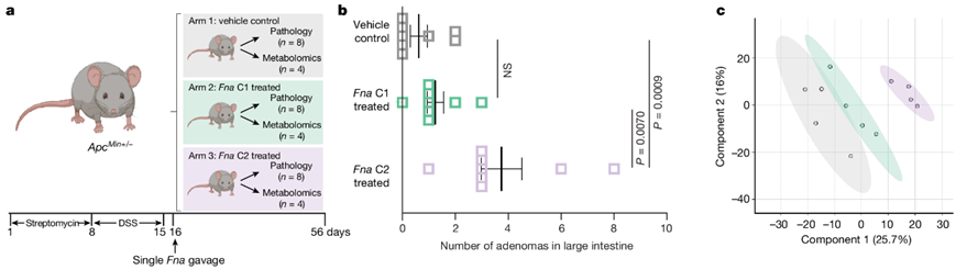 由于富含Fna C2 的基因聚类主要与增强的代谢潜力相关(图S3e),在右旋糖酐硫酸钠诱导的结肠炎ApcMin+/- CRC小鼠模型中,他们试图确定Fna处理是否能够影响肠道肿瘤发生和体内代谢途径(图4a)。为了捕获更高比例的Fna进化枝特异性辅助基因(图S2d),他们对每个进化枝使用了三种代表性菌株的混合物。在单次口服Fna C1 混合物、Fna C2 混合物或载体对照后,到与Fna C1 和载体对照相比,Fna C2 处理的小鼠肠道腺瘤数量显著增加,特别是在大肠中(图4b)。Fna C1 处理小鼠和载体对照小鼠之间的腺瘤负荷没有显著差异。