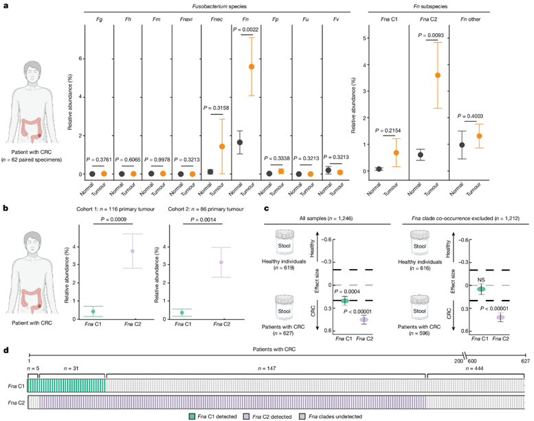 (a) 显示Fn的相对丰度(左),以及Fn亚种和Fna进化枝(右)配对肿瘤(橙色)和正常邻近组织(黑色)的微生物 16S rRNA 基因测序。 (b) 图显示来自两个独立队列(队列 1 -本研究;队列 2-BioProject PRJNA362951)的患者原发性结直肠肿瘤组织中Fna C1(绿色)和Fna C2(淡紫色)的相对丰度。(c) CRC患者和健康个体粪便宏基因组数据中的Fna C1和Fna C2检测。(d) CRC 患者粪便宏基因组中存在Fna C1 和Fna C2。